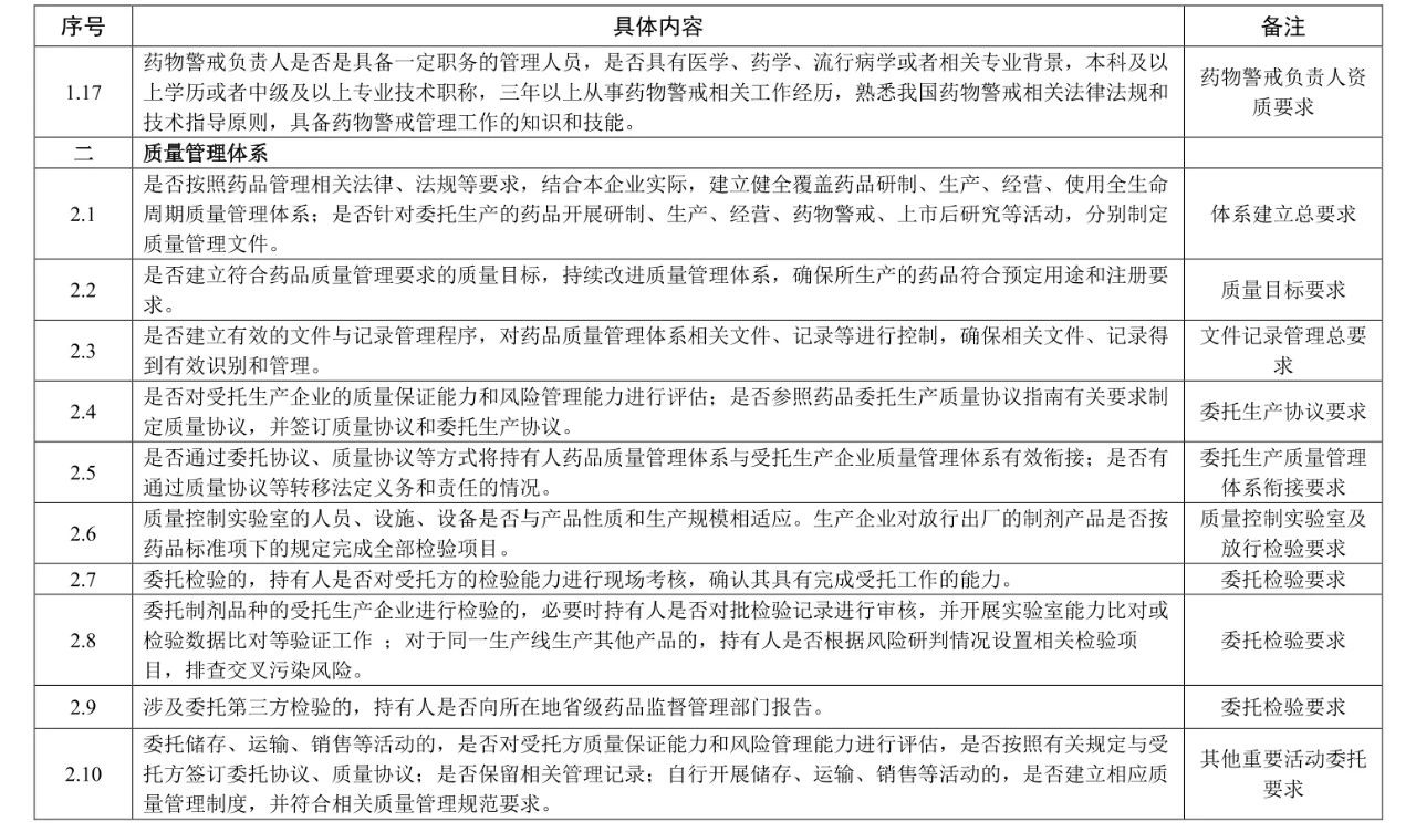 (九)各省級(jí)藥品監(jiān)督管理部門應(yīng)當(dāng)加強(qiáng)政策宣貫,督促本行政區(qū)域內(nèi)的委托生產(chǎn)持有人對(duì)照《持有人監(jiān)管規(guī)定》和本通知要求開展全面自查。自查重點(diǎn)包括:覆蓋藥品研制、生產(chǎn)、經(jīng)營(yíng)、使用全過程的質(zhì)量管理體系的建立情況,組織機(jī)構(gòu)建立健全情況,按規(guī)定配備關(guān)鍵崗位人員情況;對(duì)受托生產(chǎn)企業(yè)的質(zhì)量管理體系定期審核情況;培訓(xùn)管理制度、年度報(bào)告制度、藥物警戒制度、藥品追溯制度等建立實(shí)施情況;結(jié)合產(chǎn)品風(fēng)險(xiǎn),定期組織回顧分析情況,定期組織自檢或內(nèi)審情況。