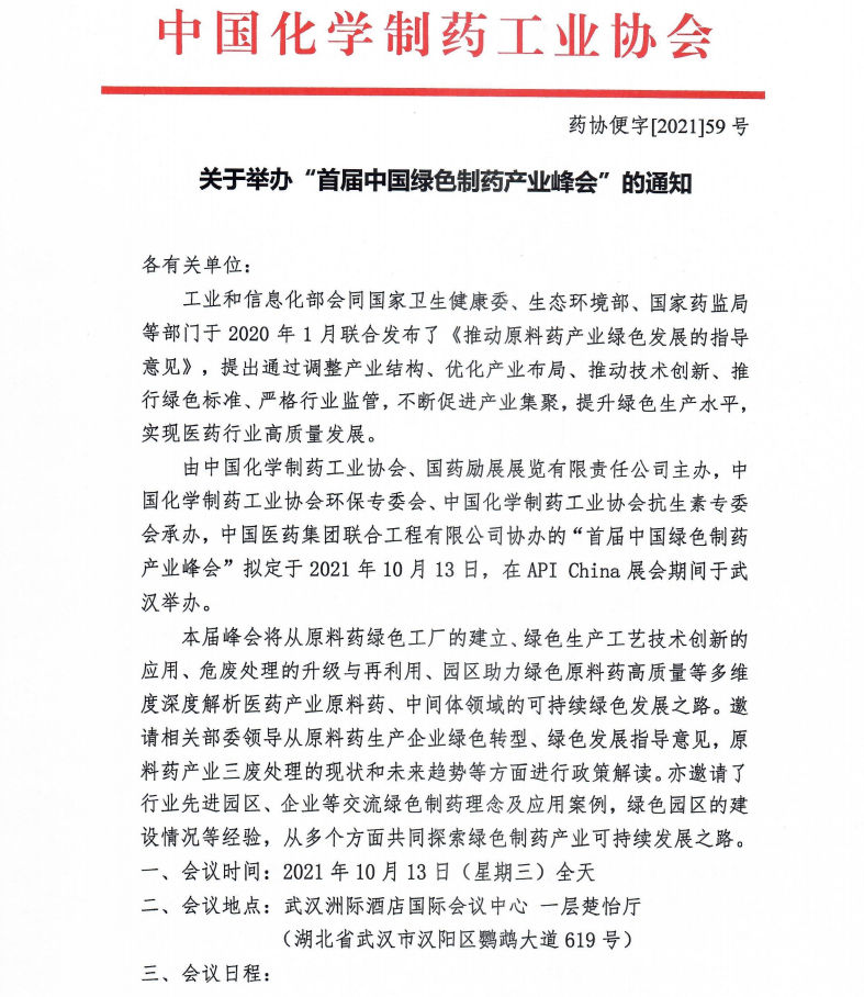 關(guān)于舉辦“首屆中國綠色制藥產(chǎn)業(yè)峰會”的通知
